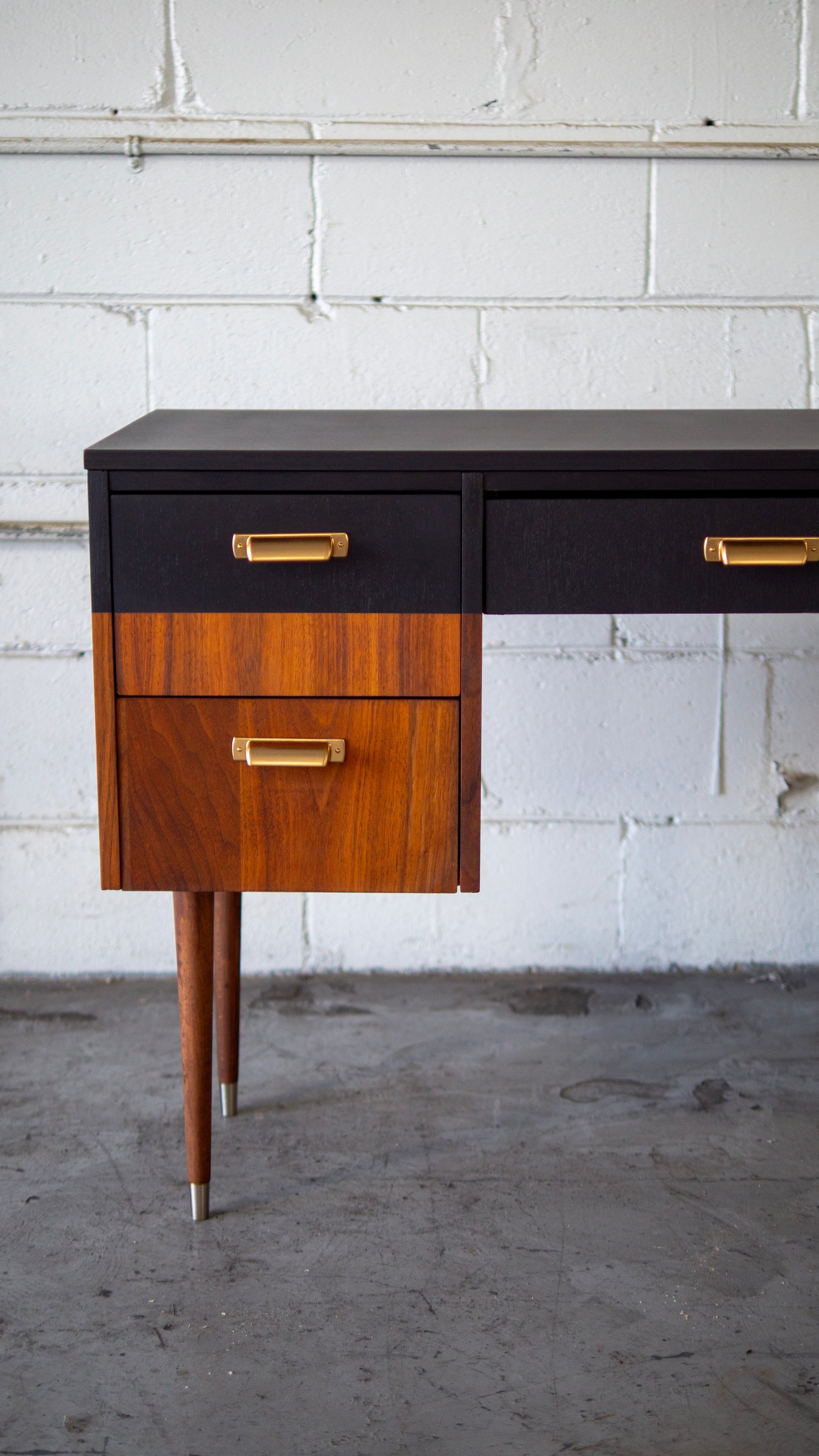 The most beautiful piece ever. One of a kind. A stunning refinished, desk from the 70s. The perfect designer, mid-century modern desk, refinished with love by hand. Partial painted in black with elegant brass gold office handles. No need to place against a wall. Both sides are refinished for beautiful viewing. Perfect if you’re in a studio or loft space. Very compact, but enough storage to keep your office supplies hidden and neat.