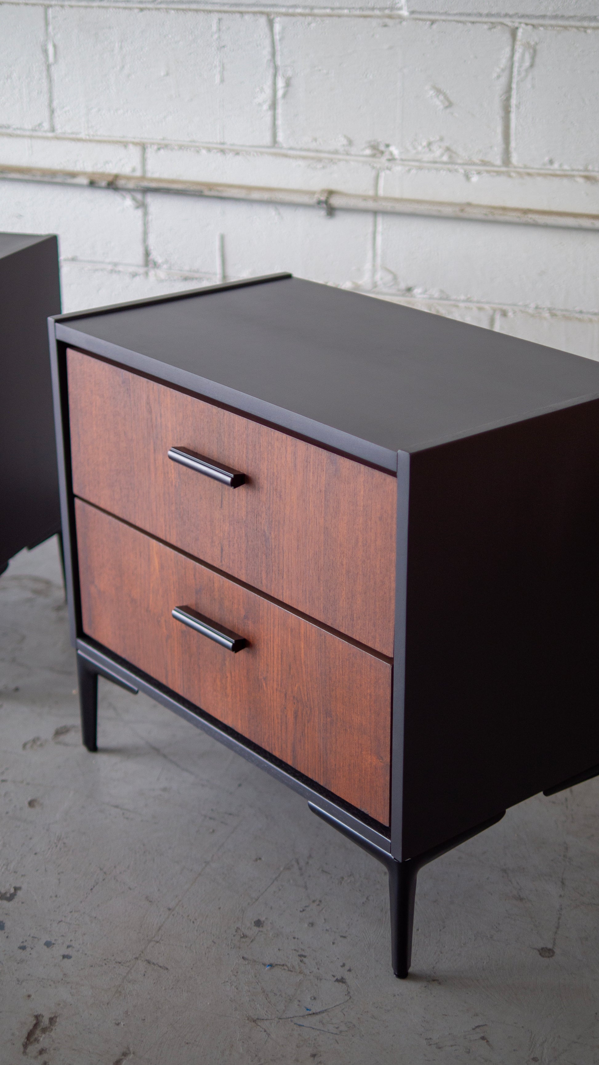 A stunning refinish of vintage rosewood nightstands from the 1970s completed with a modern twist. Excellent condition and beautiful graining on drawers. Base is painted in charcoal black. Complete modernized look with stiletto metal legs.
