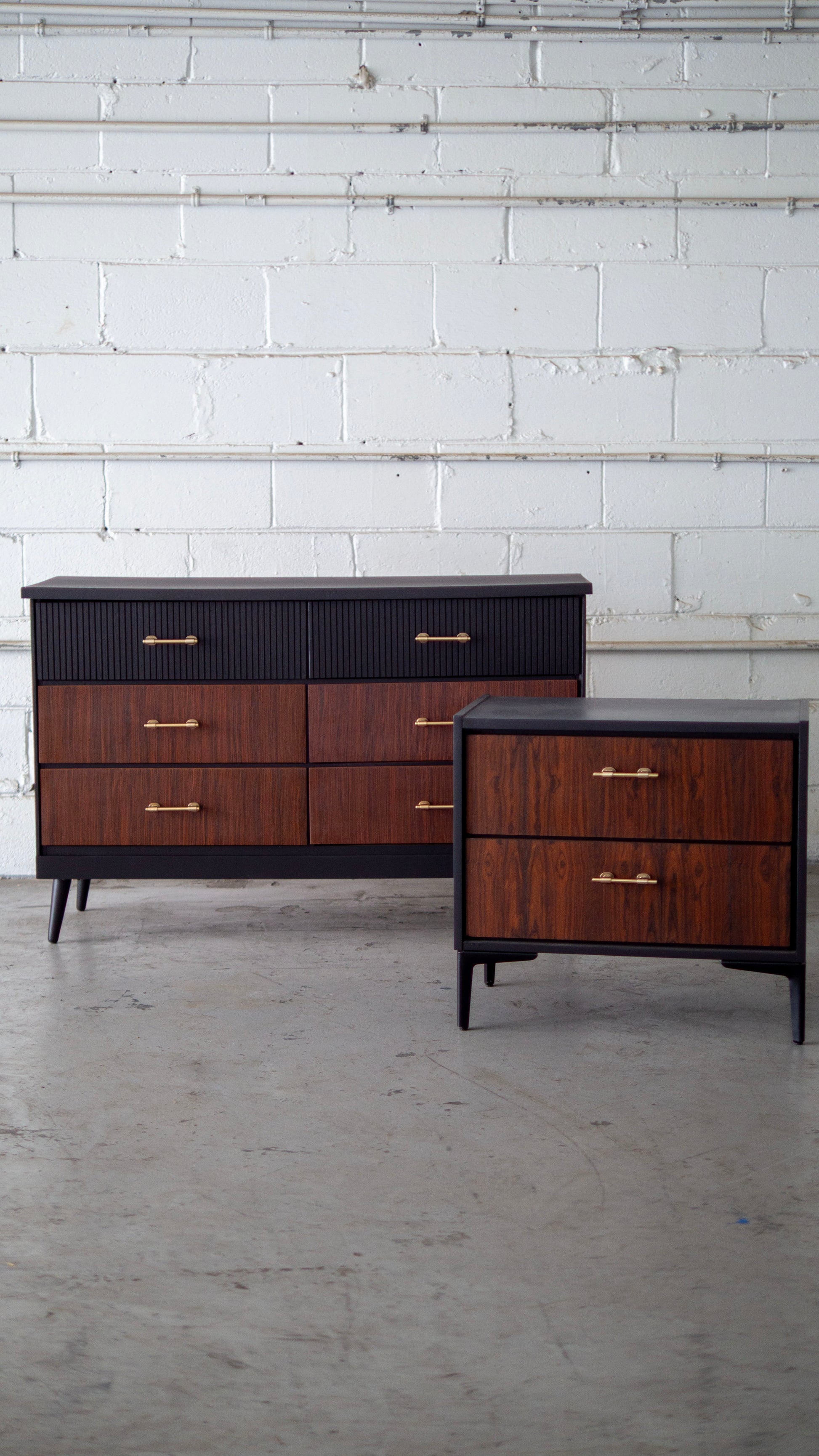 A stunning refinished, charcoal black fluted 6 drawer dresser with beautiful rosewood drawer fronts, vertical graining. Our most popular bedroom style. Elegant gold handles elevate the look to a beautiful upscale modern look.